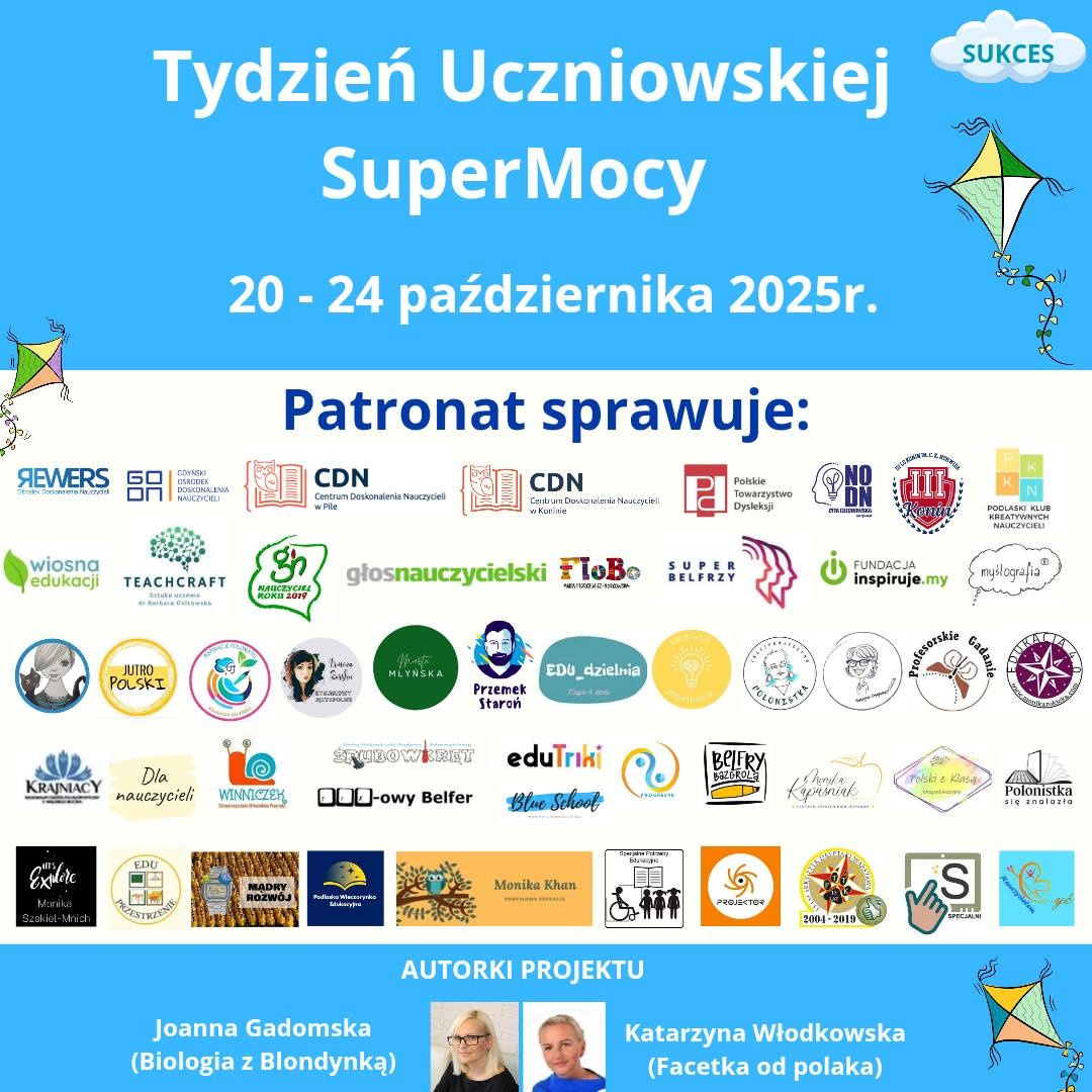 - - Hasło przewodnie Tygodnia Uczniowskiej SuperMocy w 2025 roku - Bądź jak latawiec!    - - Hasło przewodnie Tygodnia Uczniowskiej SuperMocy w 2022 rokiu - Moja Droga do gwiazd. - Cele Tygodnia Uczniowskiej SuperMocy to: